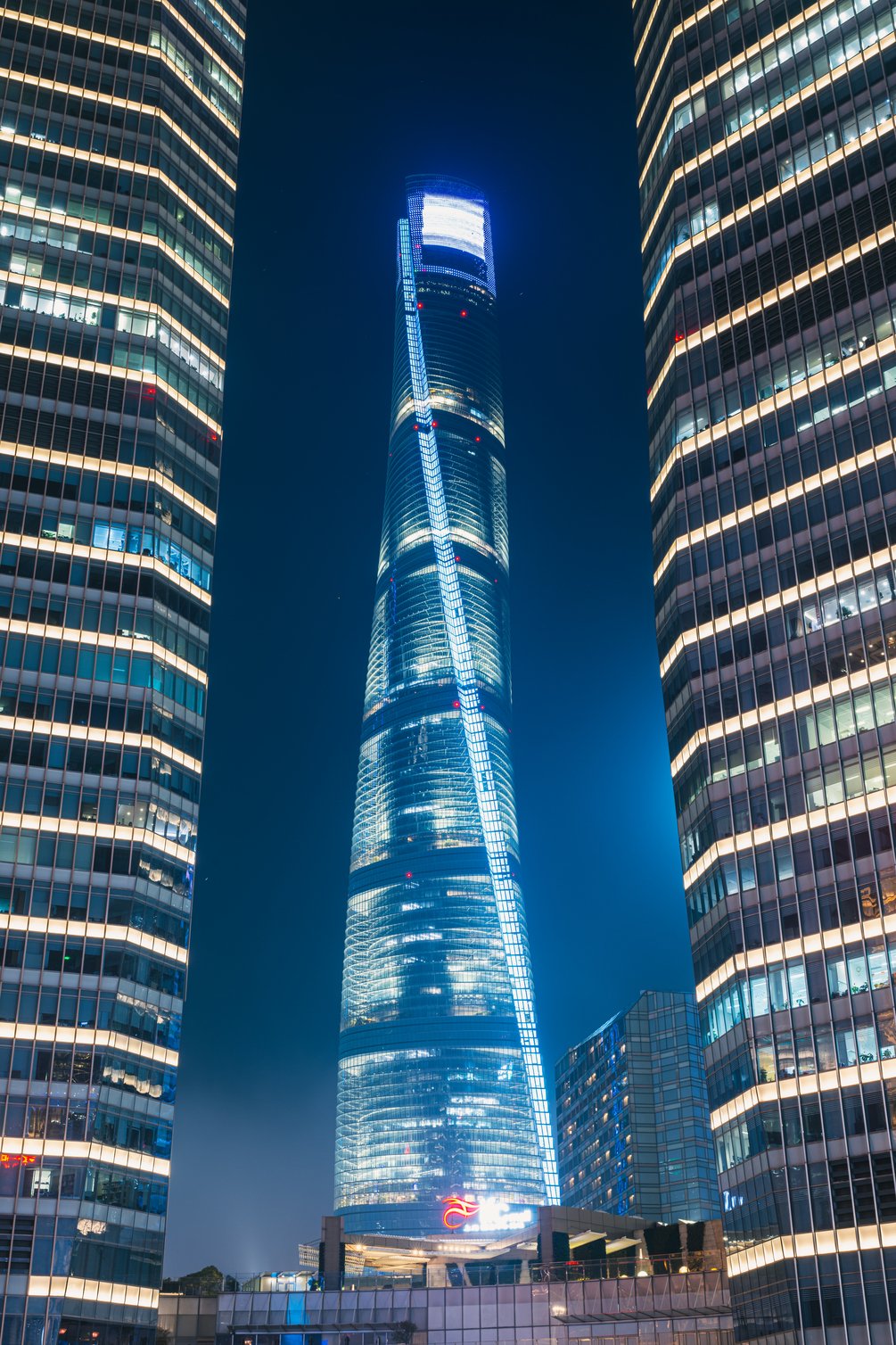 You'll get an image of the Shanghai Tower during night-time framed between two office buildings